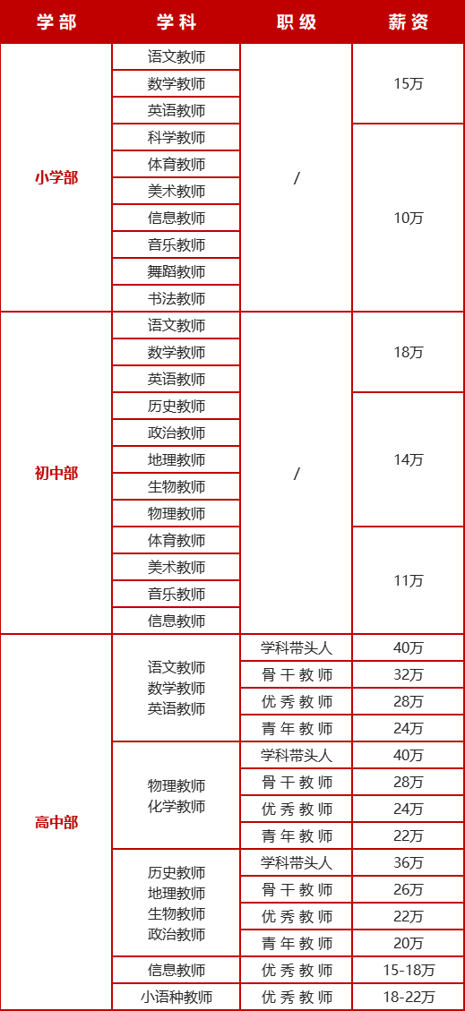 1.基本要求: 全日制普通高等院校本科及以上学历相关专业毕业,并取得相应学科教师资格证,年龄45周岁以下。 2.从教经验: 小学部、初中部教师:五年以上优质民办学校教学经验,三年以上班主任工作经验。 高中部教师:学科带头人:获得优质学校名师称号,曾任教研组长或备课组长,具有高中代课4轮以上或高三毕业班代课5年以上教学经验; 骨干教师:曾在优质学校任班主任,具有高中代课3轮以上或高三毕业班代课4年以上教学经验; 优秀教师:曾在优质学校任班主任,具有高中代课2轮以上或高三毕业班代课3年以上教学经验; 青年教师:具有高中代课1轮以上或高三毕业班代课2年以上教学经验; 3.优先录用: 获得省特级教师,省市级名师,地市级、区级学科带头人、教学能手、教学新秀,优秀教育工作者或者优秀班主任等荣誉称号者优先录用。 |